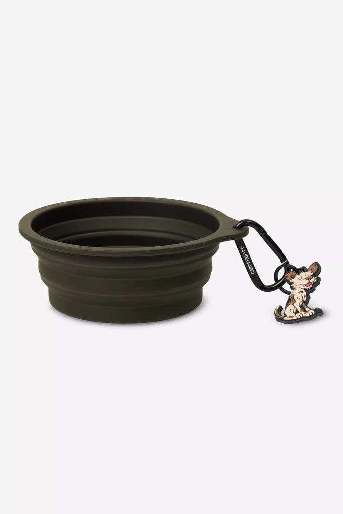 The Wild Dog Foldable Bowl is made from silicone. The design features a graphic rubber pendant with a branded carabiner. A printed Script Logo appears on the bottom of the bowl.