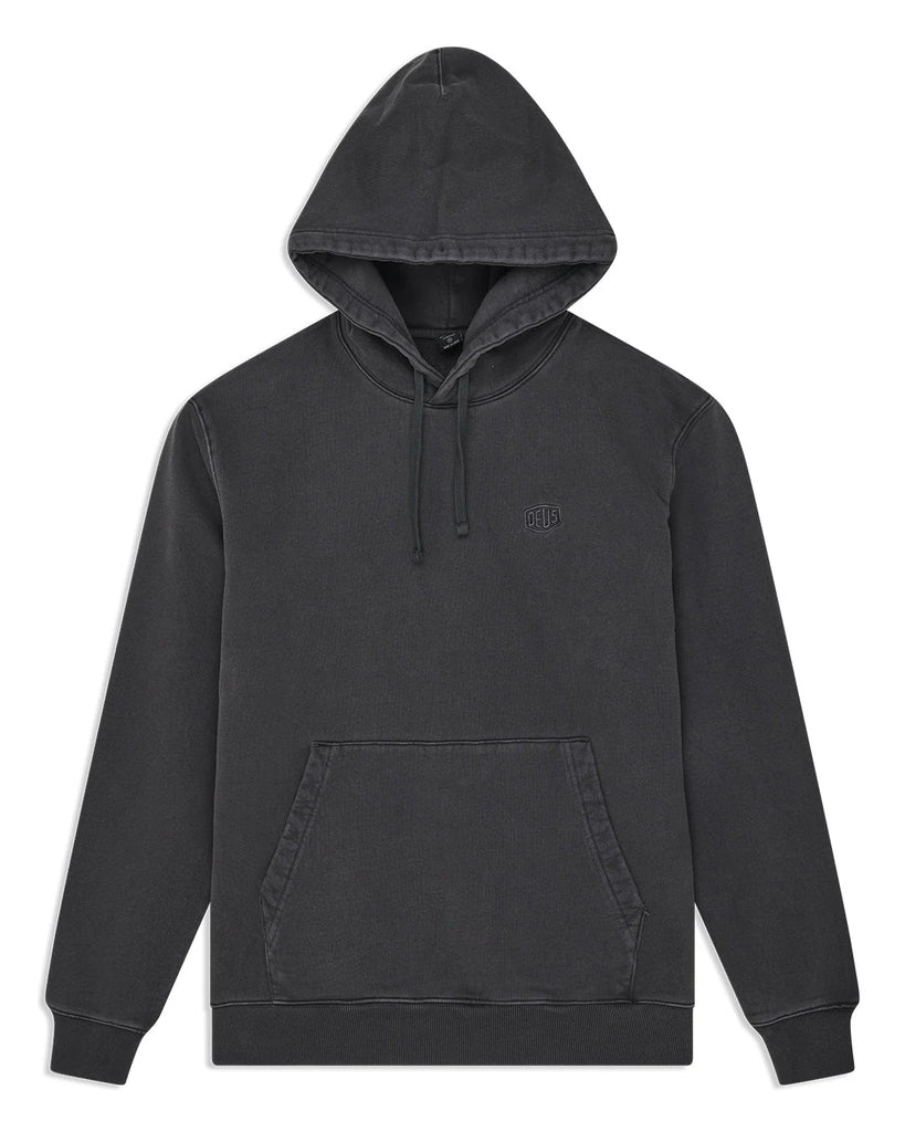 The Deus Shield needs no translation: this garment dyed hoodie carries the emblem that fuels endless adventures.