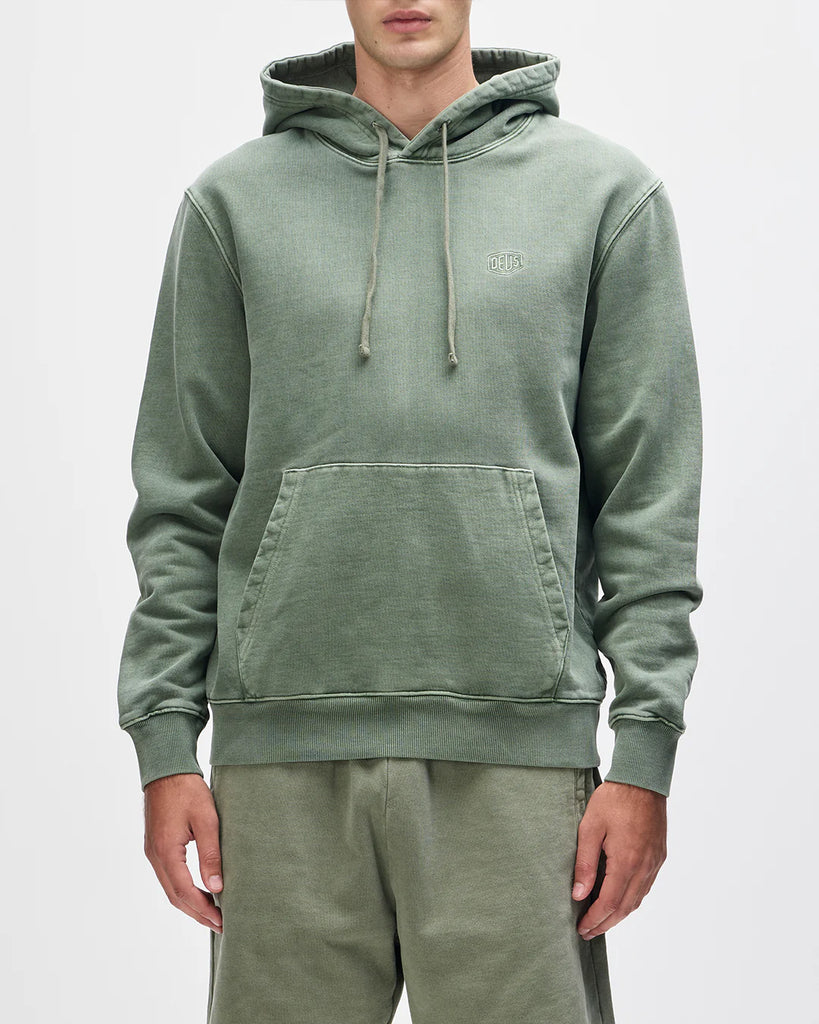 The Deus Shield needs no translation: this garment dyed hoodie carries the emblem that fuels endless adventures.