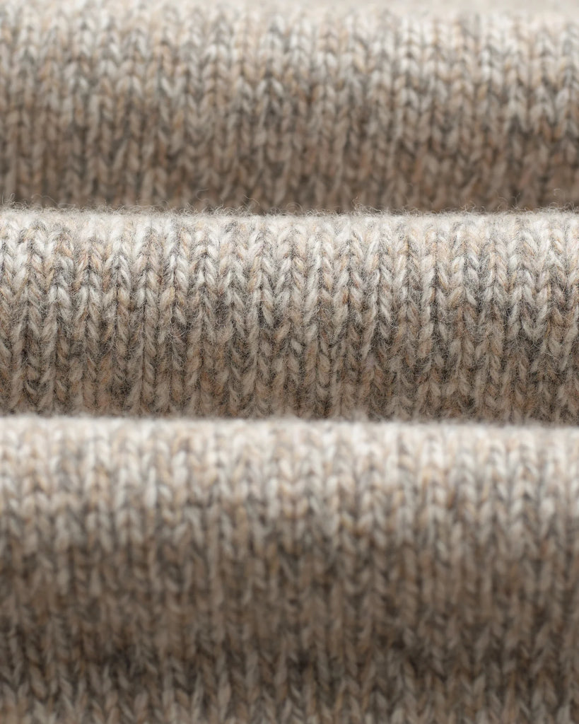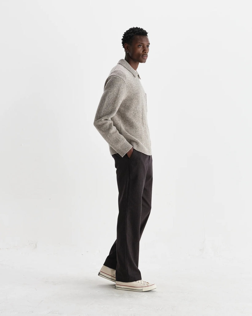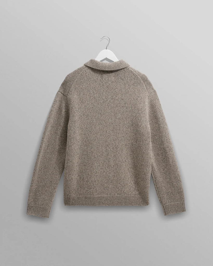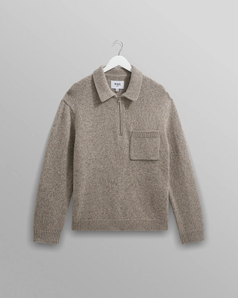 This quarter zip is the full package. Cut for a relaxed fit, the Alpha is crafted from a warm 100% wool with grey, natural and light brown yarns woven together to create a clean colourway that has subtle depth. It is finished with a patch pocket on the left chest, and a ribbed collar, hem and cuffs.