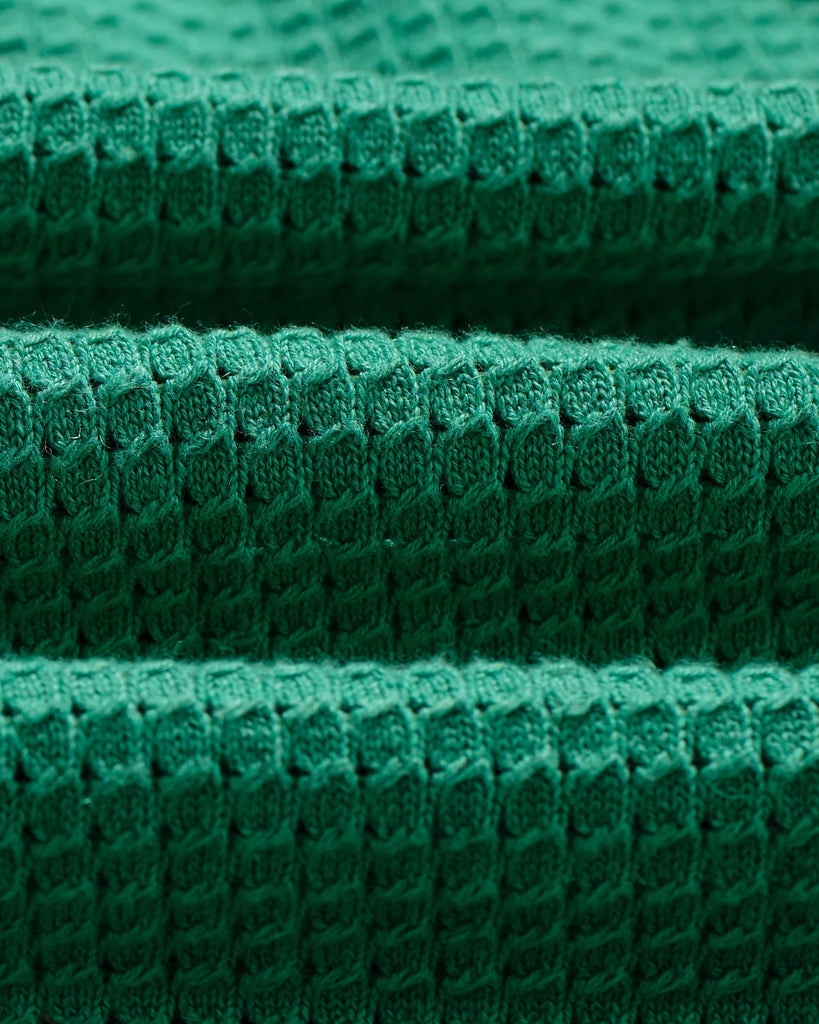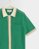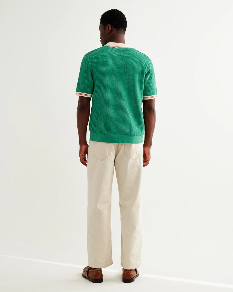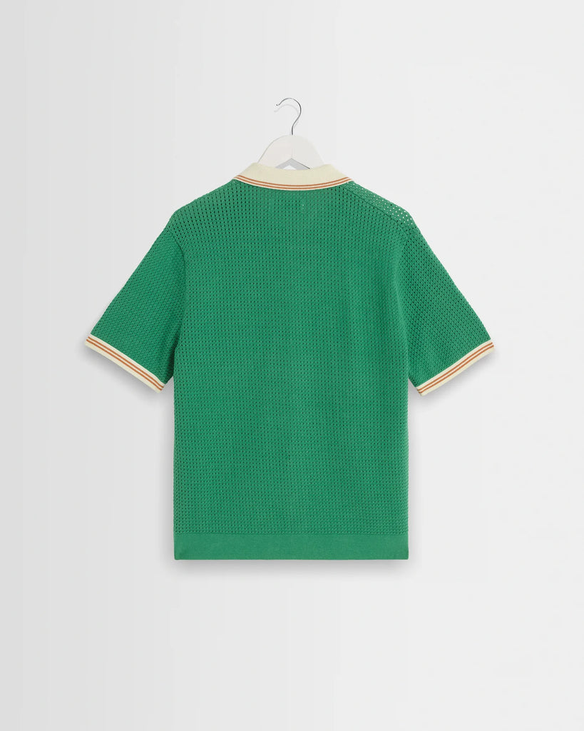 The Belle is a button-through knitted polo shirt, crafted in an airy linen-cotton blend pointelle knit with tiny open holes for breathability. It’s finished with a retro sports-inspired collar and placket, detailed with fine stripe tipping in ecru contrast against a green base.