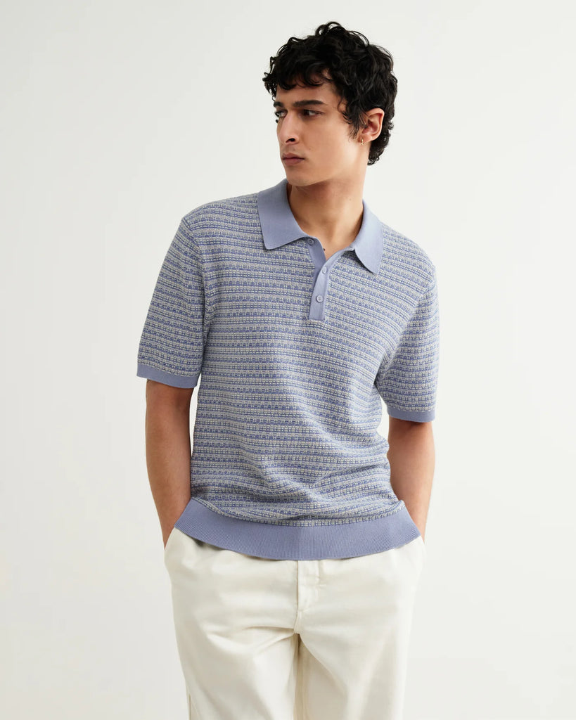 Our classic Naples polo returns for the new season. Crafted from a soft cotton-blend knit, it features a mini geometric pattern created with three tonal shades of ecru and light blue yarns, adding subtle depth and texture to this elevated staple.
