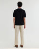 The Tellaro knitted short-sleeve shirt returns, crafted from a plain jersey knit for a clean, lightweight feel. Finished with a contrast ecru tipped collar, it features embroidered ecru chain stitch stripes and triangles running down the front - a playful, modern nod to retro classics.