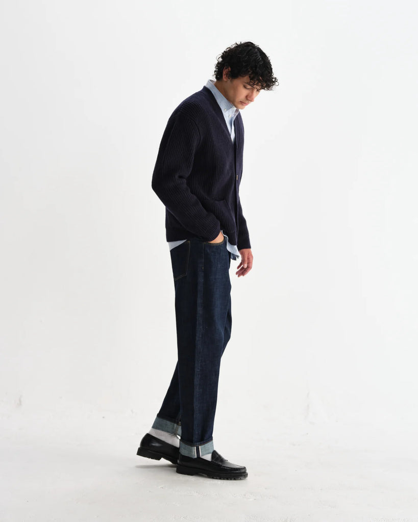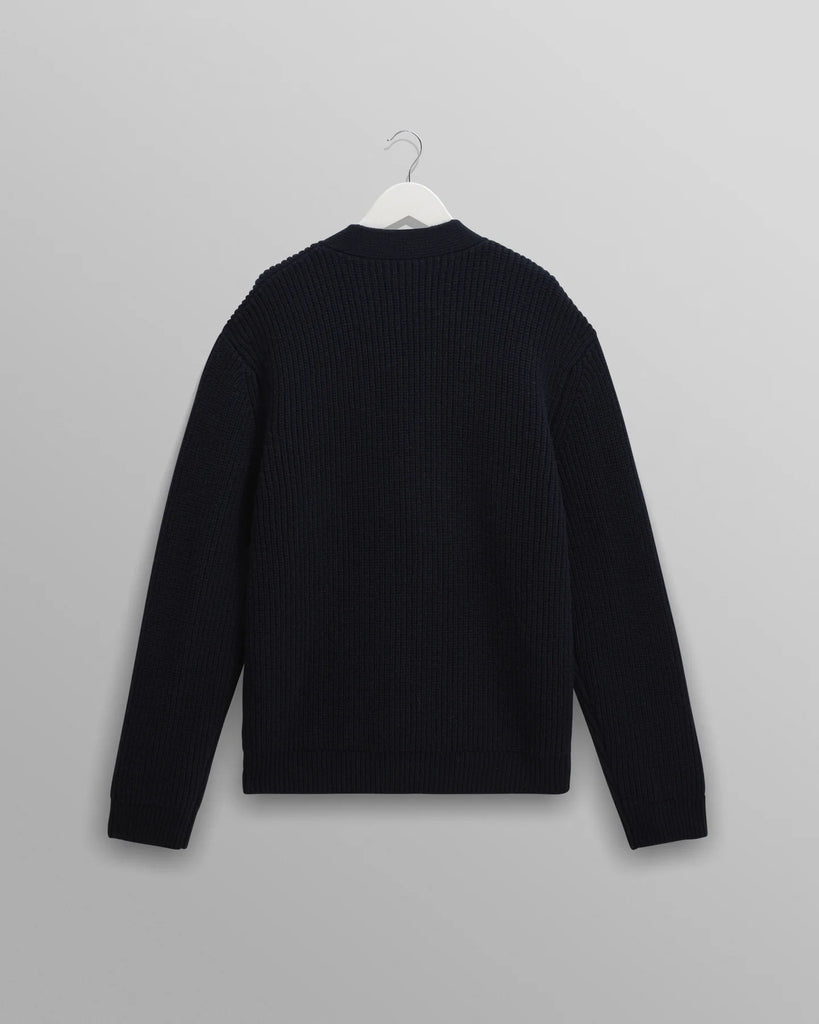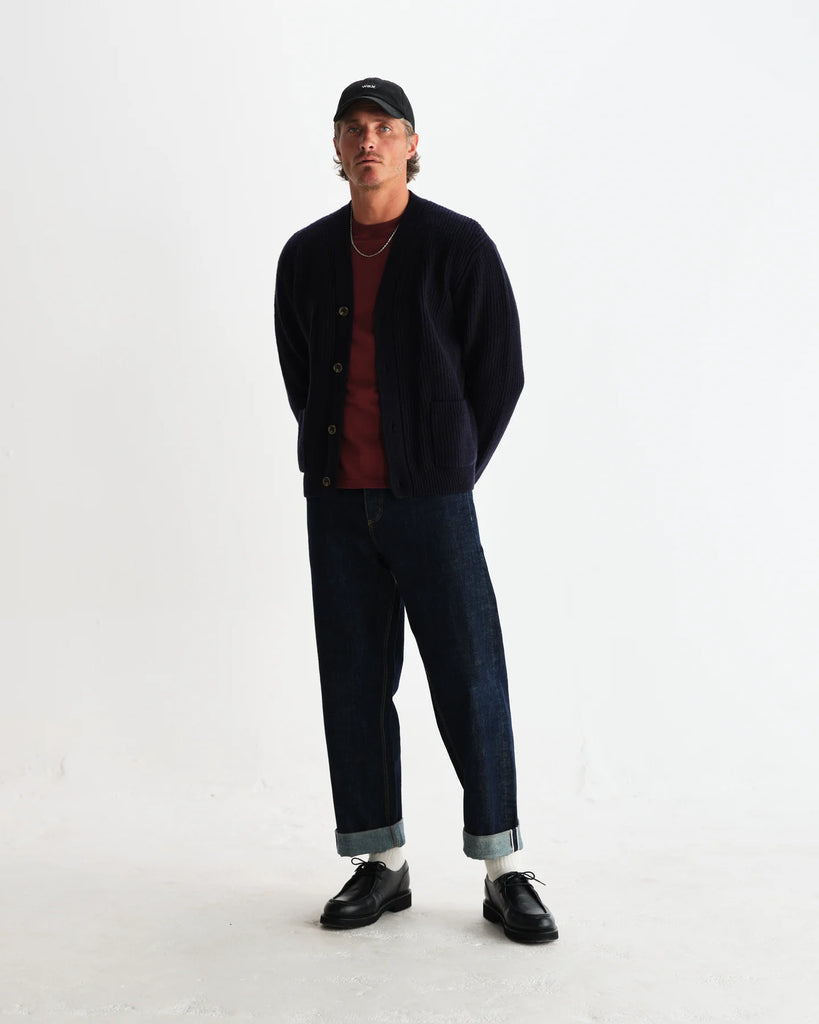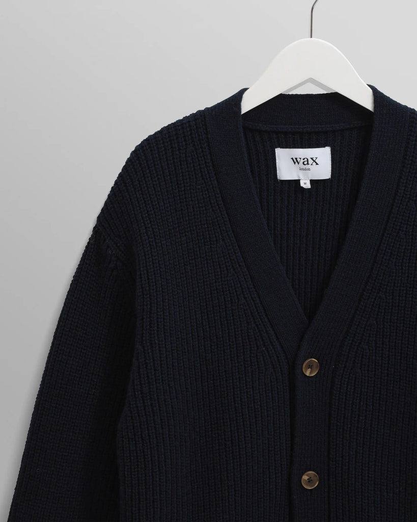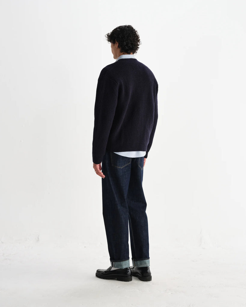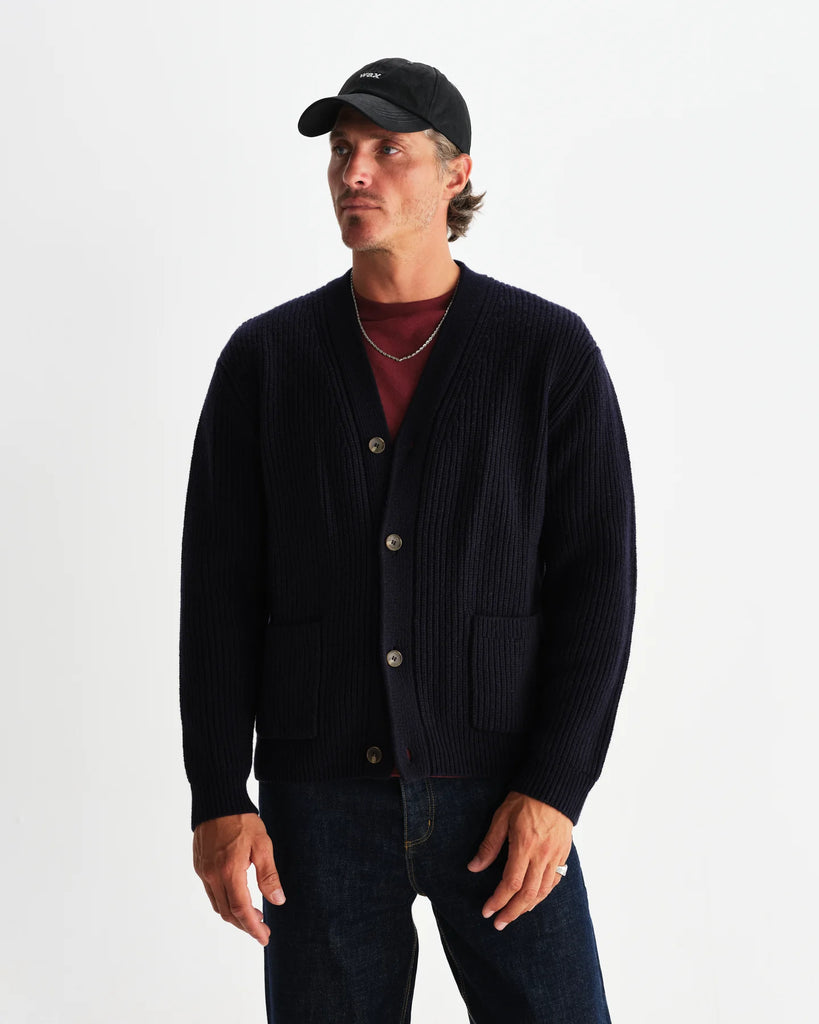 The chunky Walker returns - now better than ever. Cut in a relaxed fit with a classic v-neck cardigan silhouette, it’s crafted from a warm wool blend in a classic navy rib stitch design. Finished with two front patch pockets and ribbed trims at the collar, hem, and cuffs.