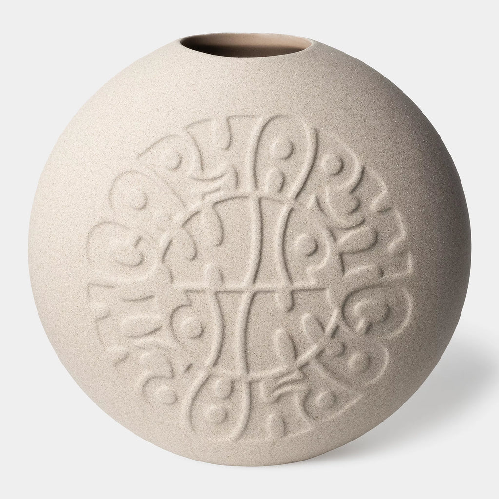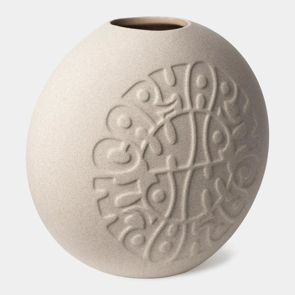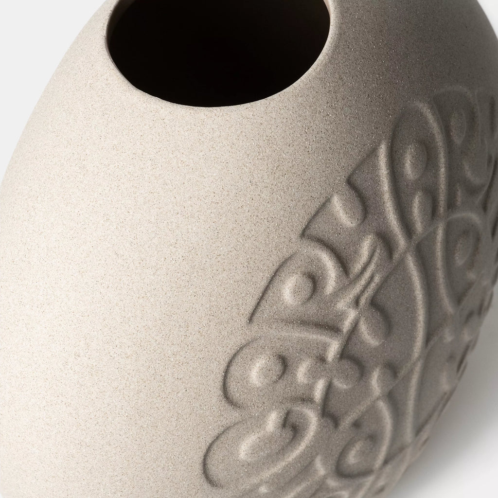 The Jazzy Vase is a stoneware item featuring debossed graphics on the front. A Script Logo appears on the base.
