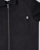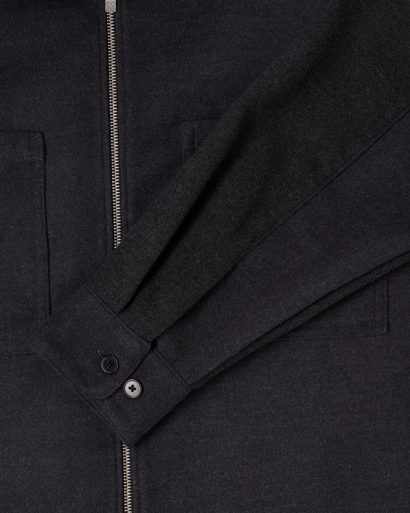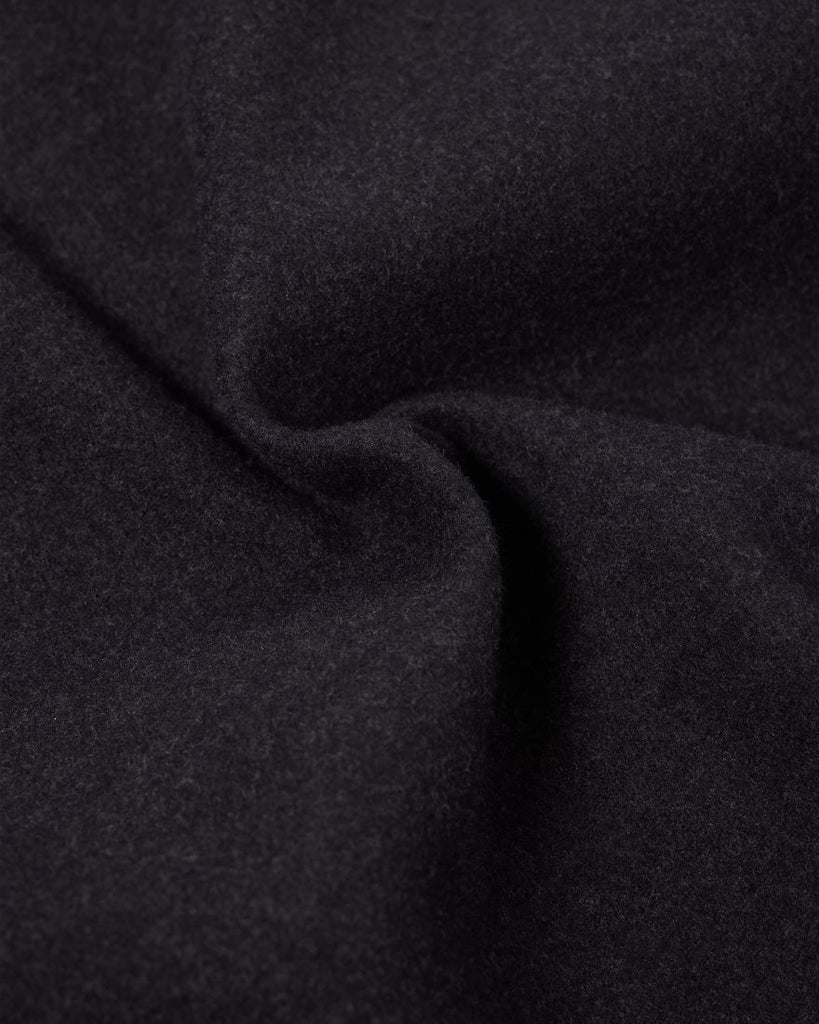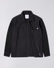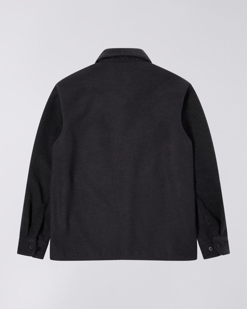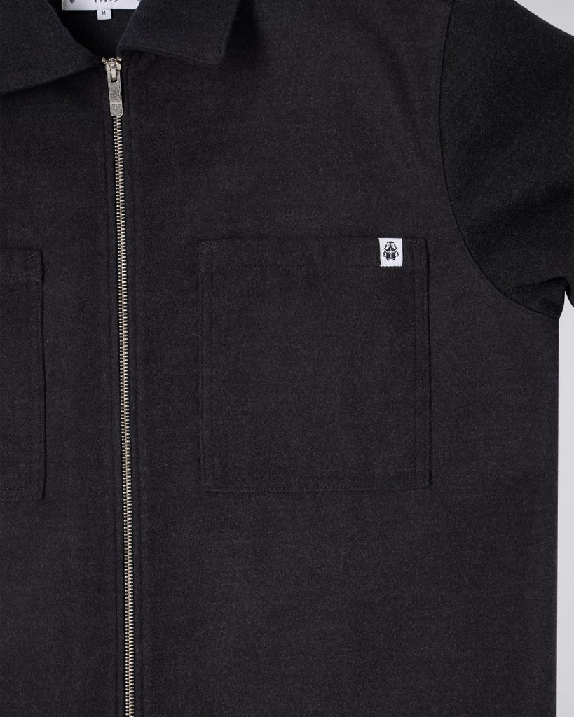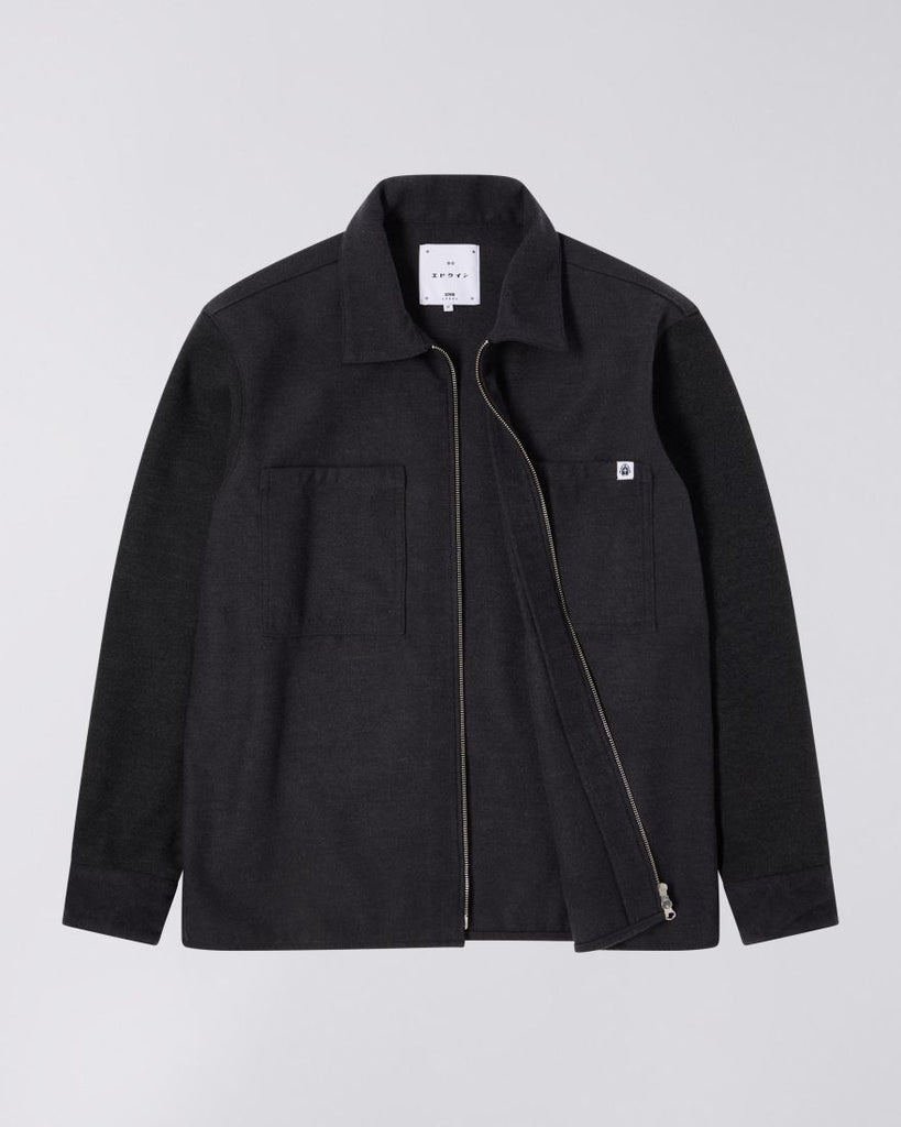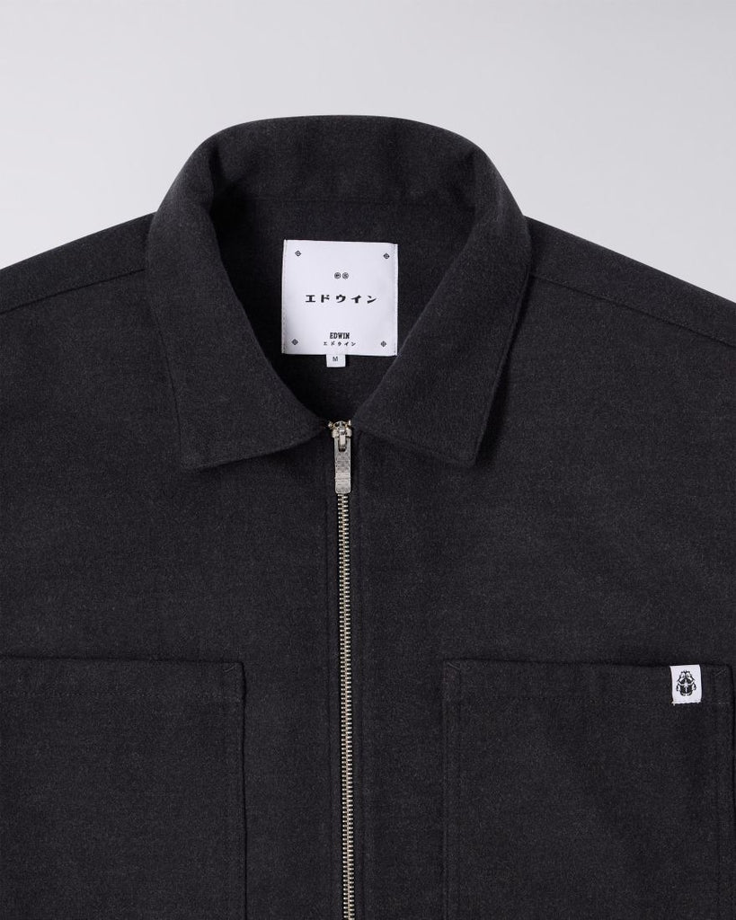 The EDWIN Snug Overshirt LS is designed with a regular fit and constructed from a heavyweight 400g/m² marl flannel fabric composed of 83% polyester, 15% viscose, and 2% elastane. It includes a front zip fastening with a custom zip pull, buttoned cuffs with two buttons each, dual front patch pockets, workwear-inspired patches on the sleeves, and an Edwin tab label affixed to the front pocket.