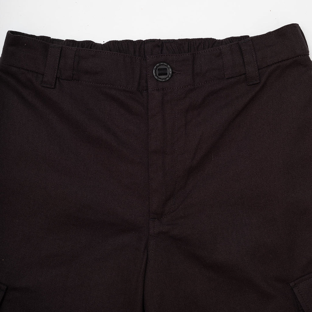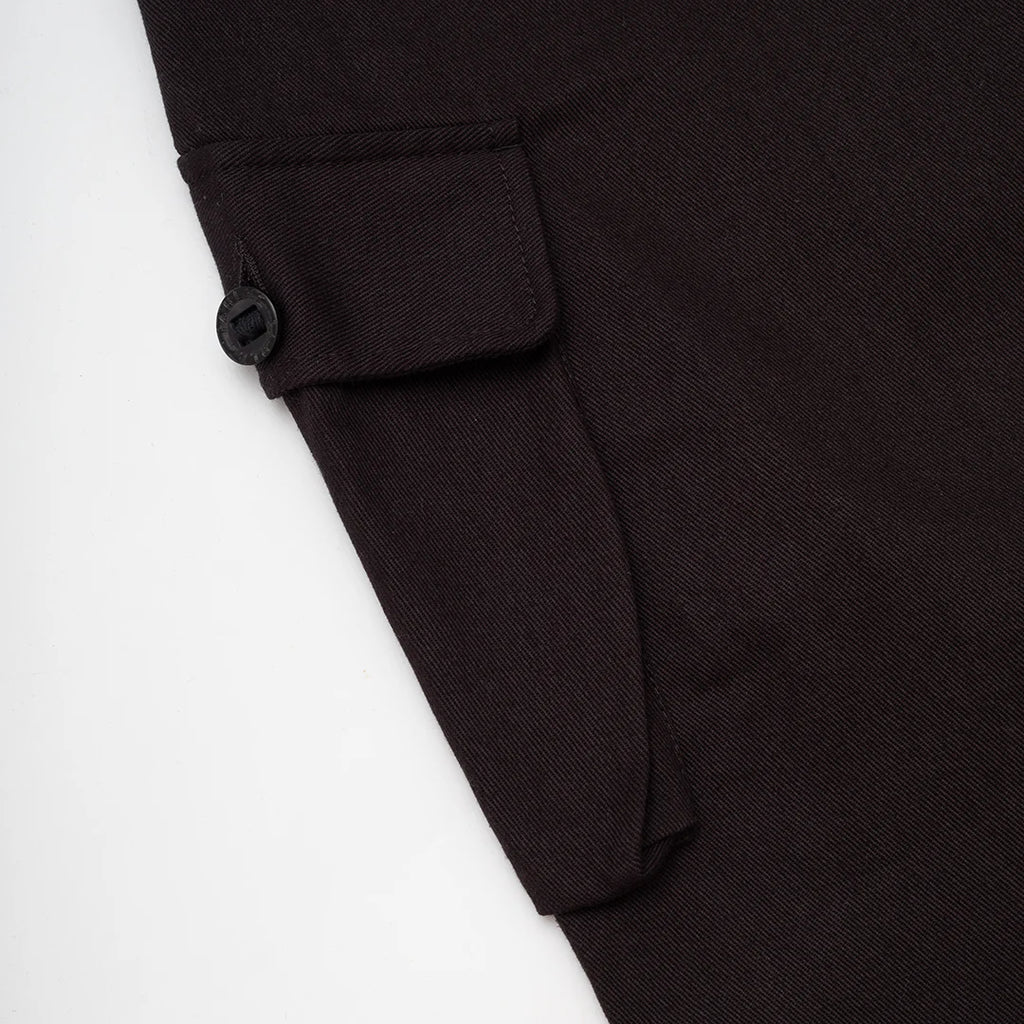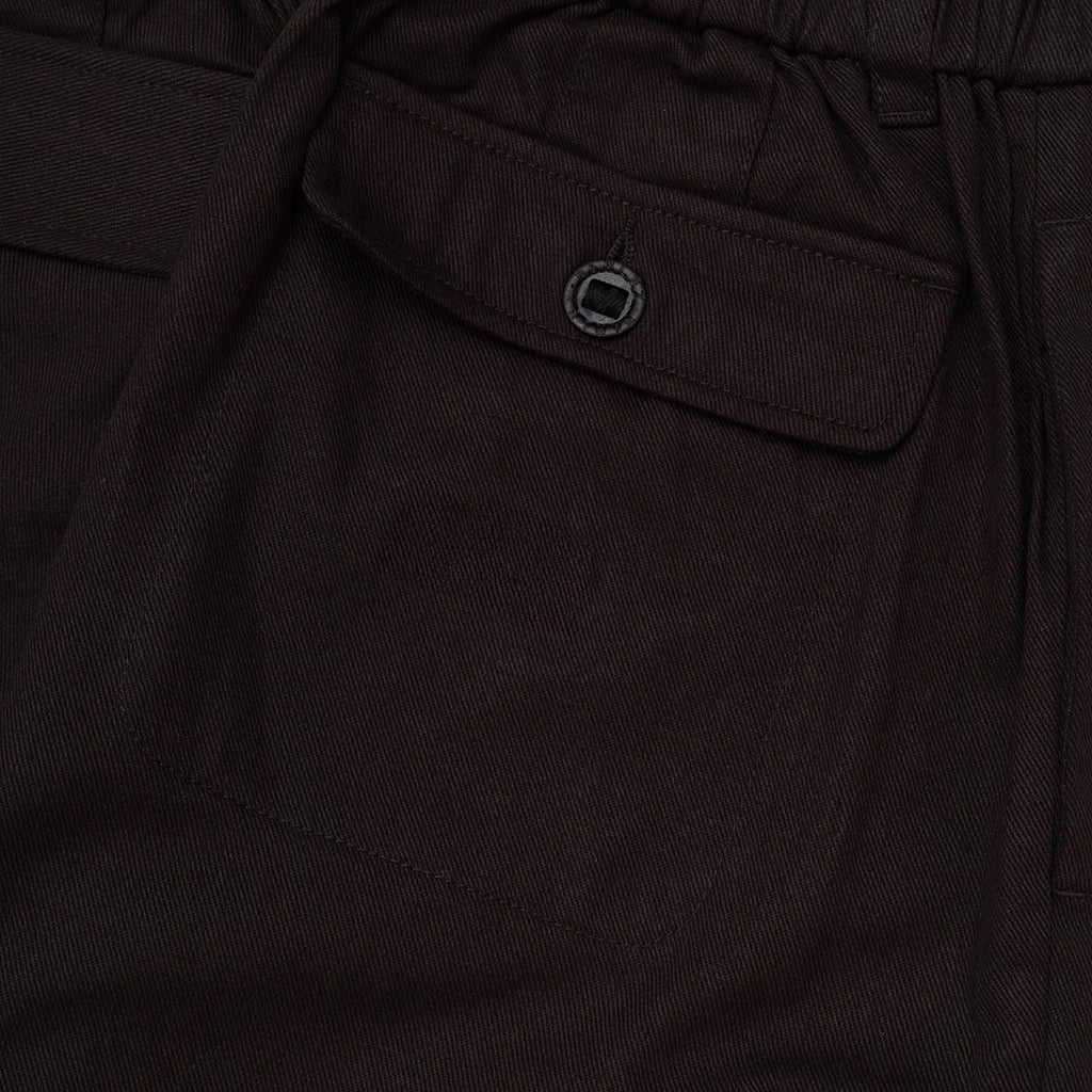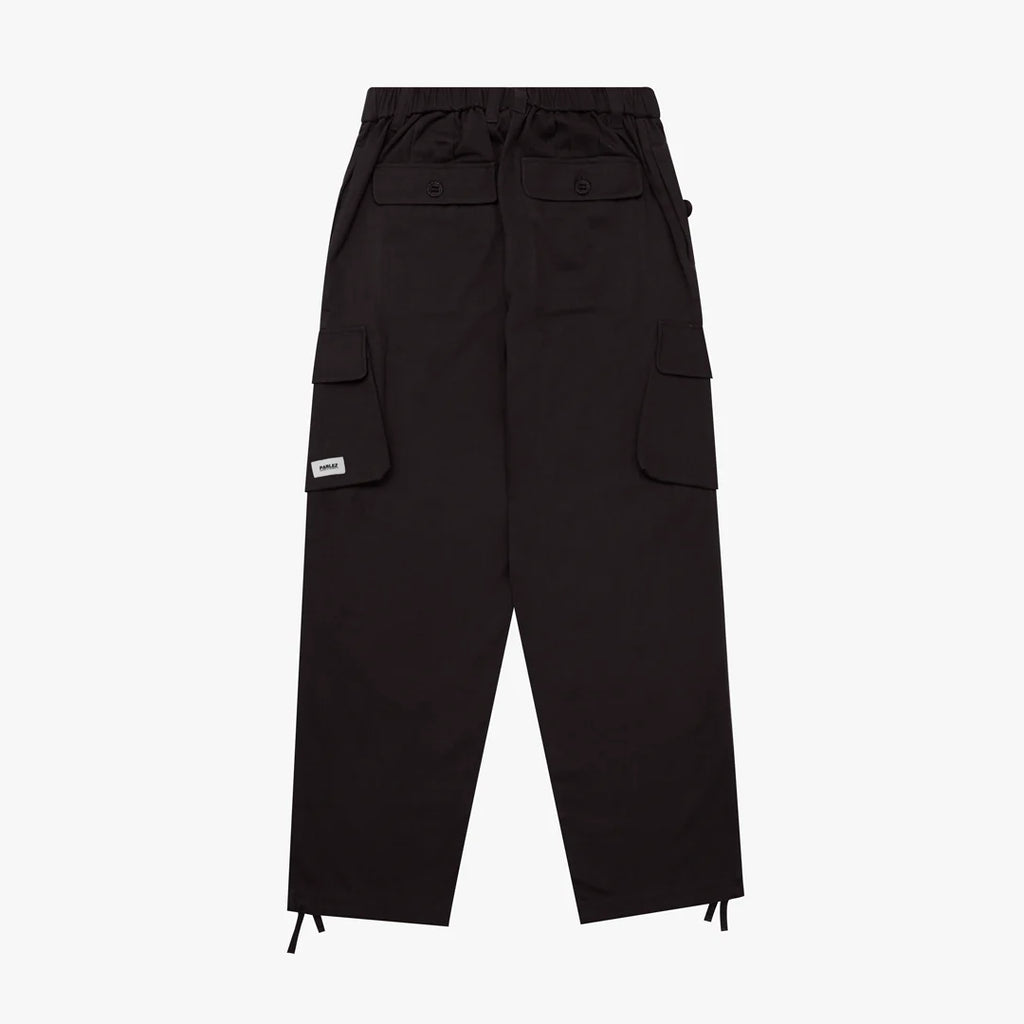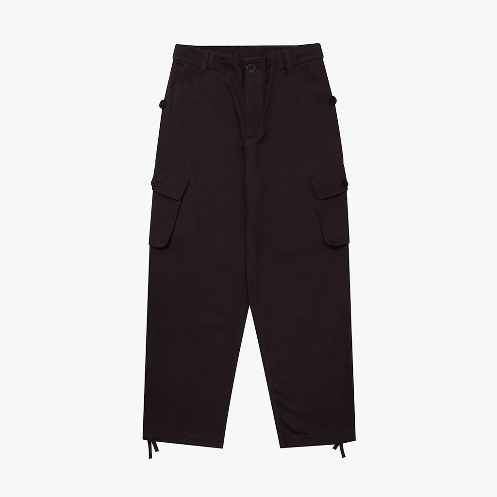 The Base Trousers in Black. Loose fit trousers, made from a durable 100% BCI cotton. Featuring a button and zip fly with a partially elasticated drawstring waist for comfort. Detailed with two side entry pockets, two back pockets and two cargo pockets with a branded woven label.