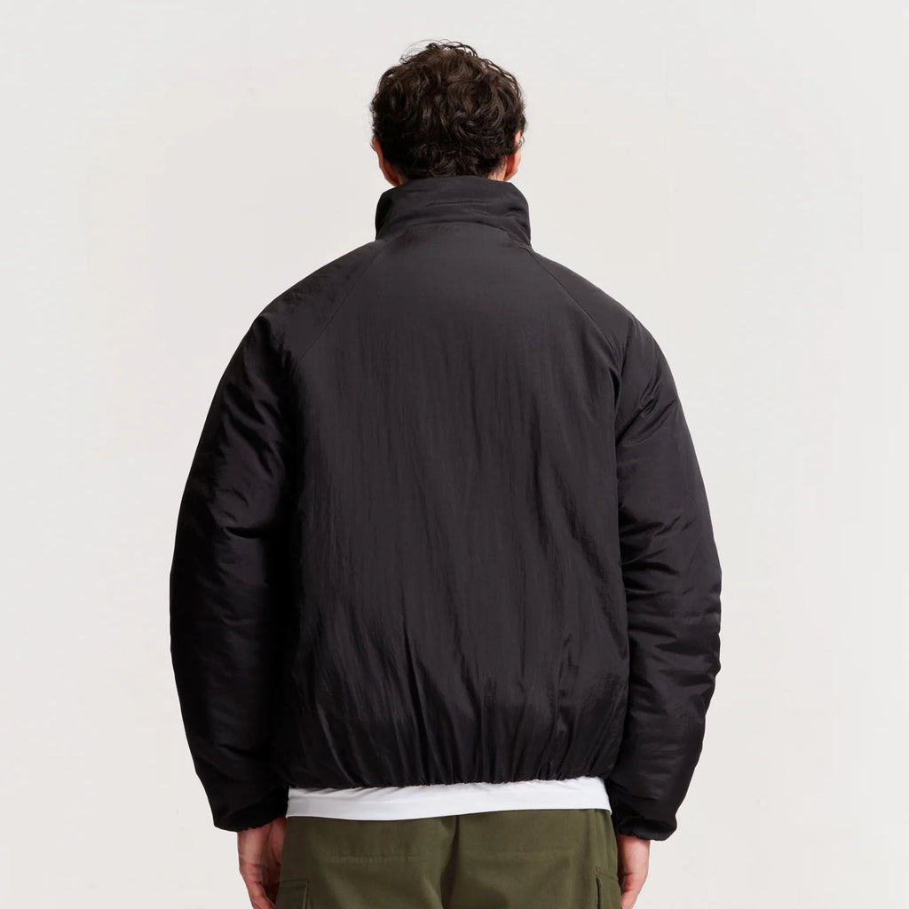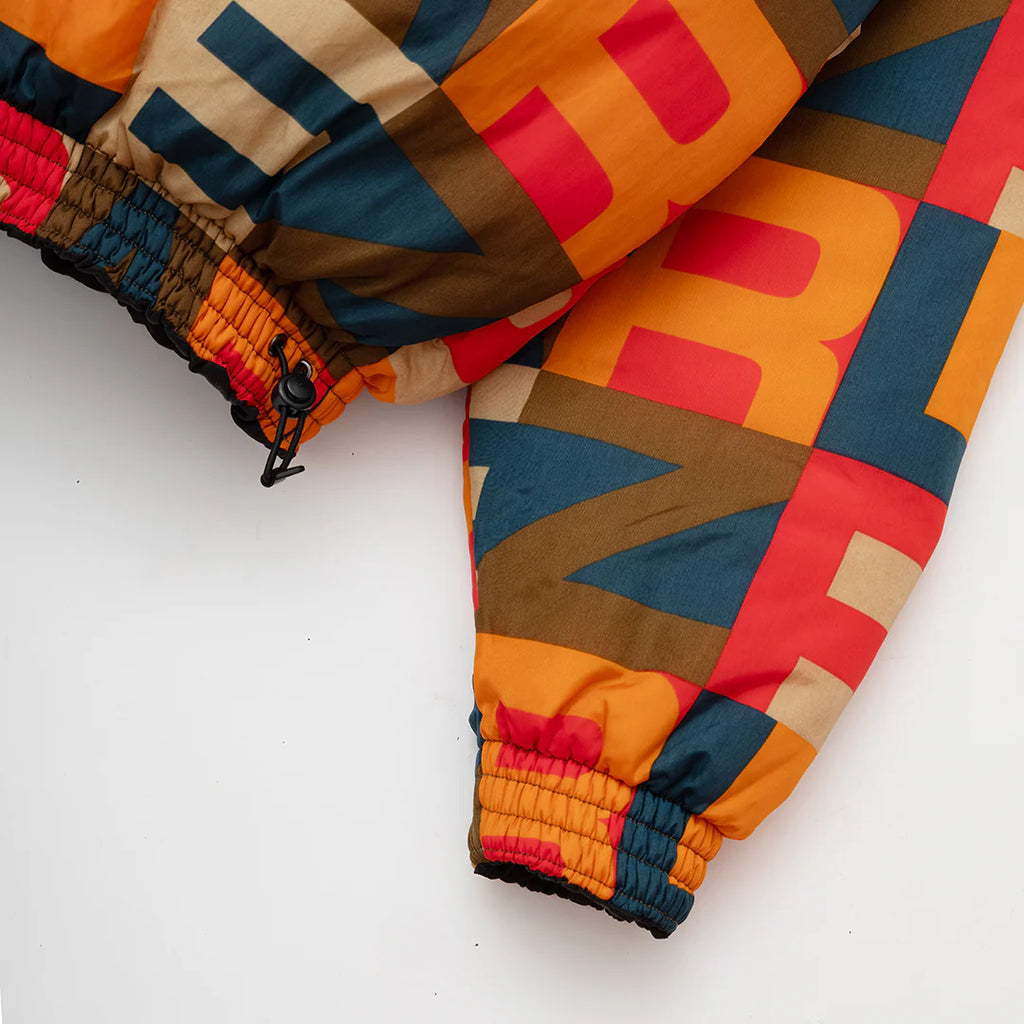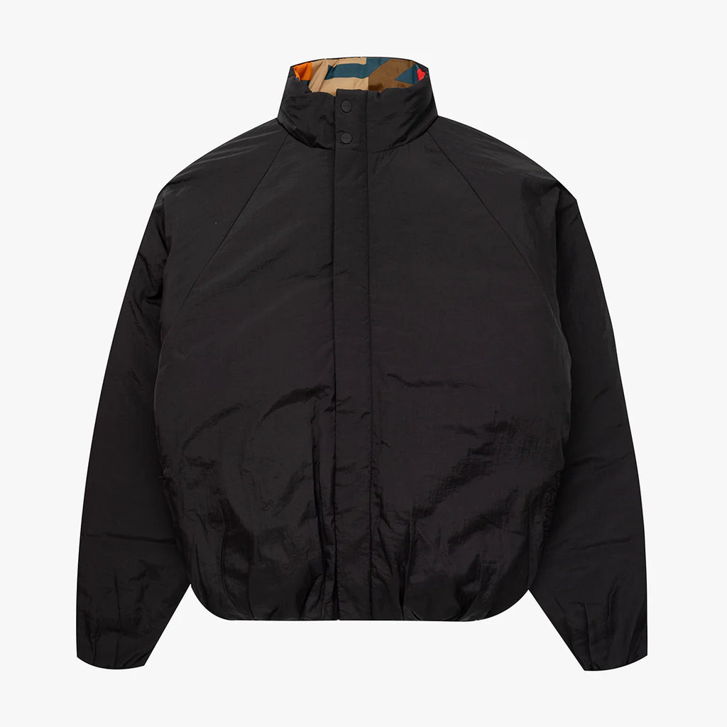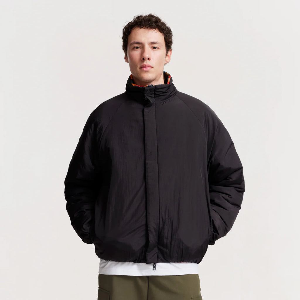 The Toast Jacket in Black/Multi. A reversible puffer jacket made from 100% recycled nylon with eco fill padding. Featuring a funnel neck, two concealed zip pockets, an adjustable bungee cord hem and a two-way zip. Detailed with a branded zip pull and logo engraved hardware.